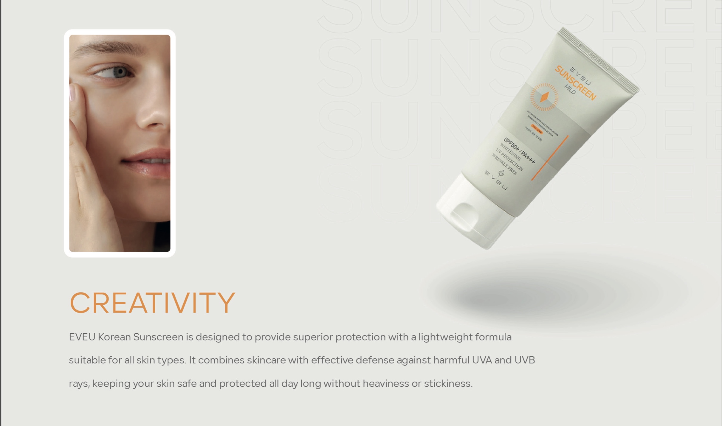 • حماية عالية: يقدم EVEU Sunscreen حماية ممتازة ضد أشعة UVA و UVB بفضل عامل الحماية SPF50+/PA+++، مما يمنح بشرتكِ درعًا وقائيًا من الأضرار الناتجة عن التعرض للشمس.
